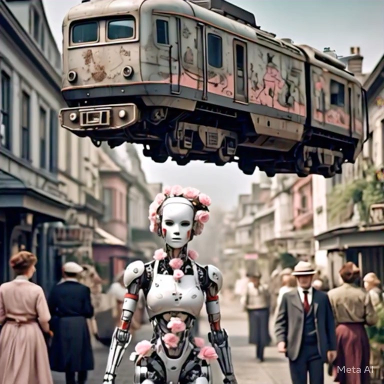 Las rosas aún la acompañan, como si quisieran recordarle que la belleza no muere, solo se transforma. Sus pétalos suaves contrastan con el frío de su estructura mecánica, una resistencia silenciosa contra la inevitable evolución.